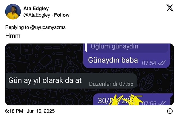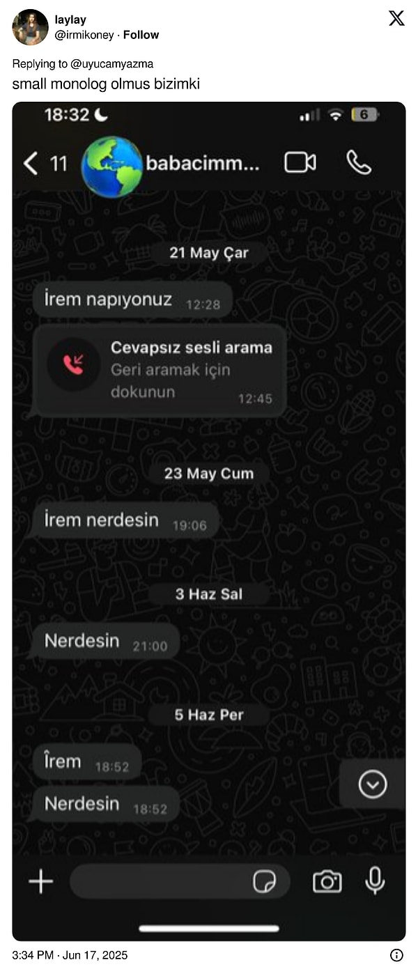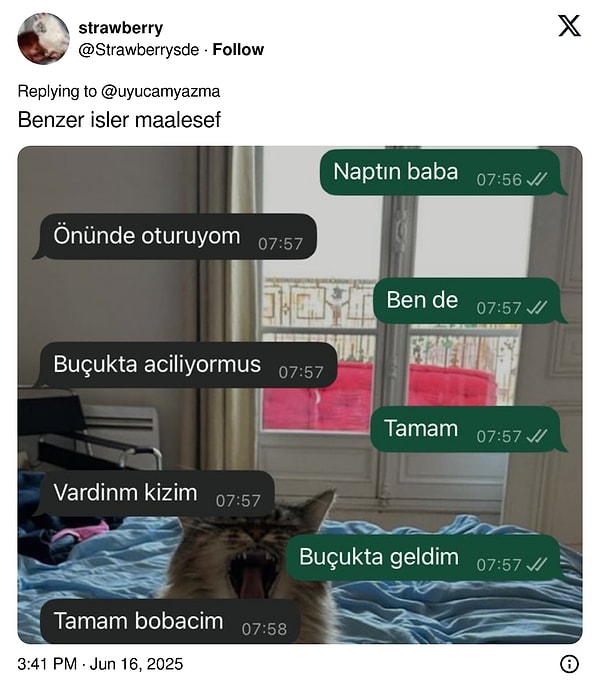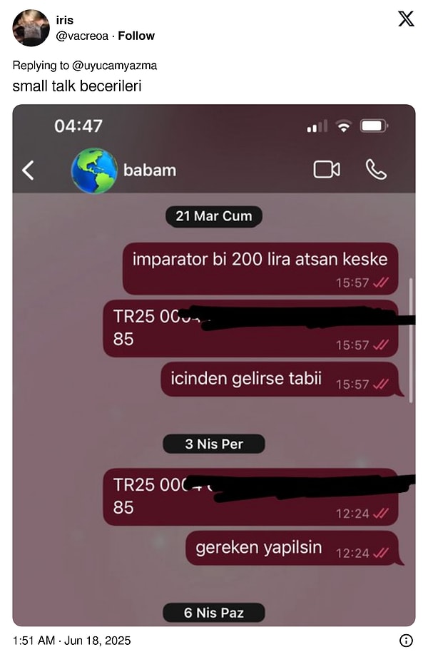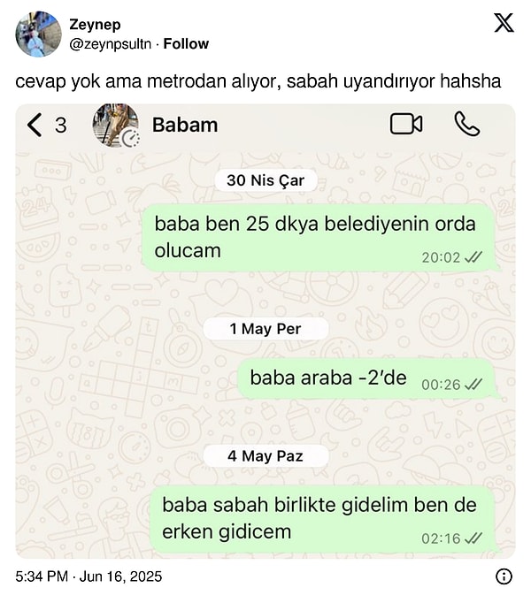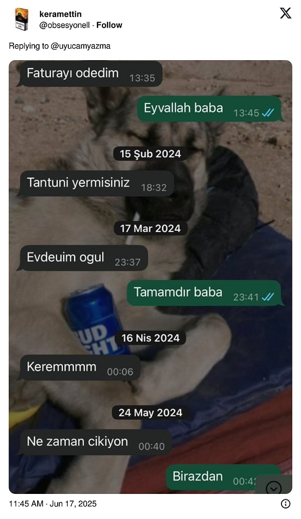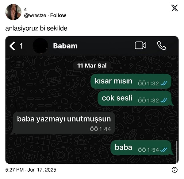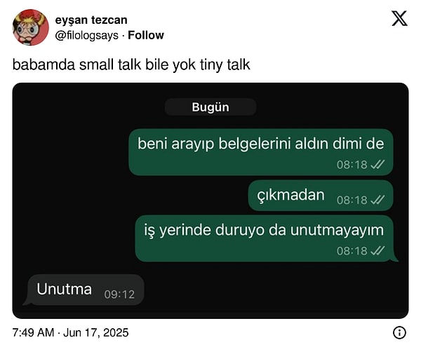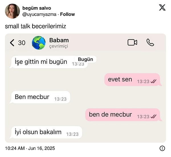 Uzun diyaloglar, bitmeyen mevzular, bahisten hususa atlama mesajlaşmanın olmazsa olmazlarından. Bazen saatlerimizi bu uğurda harcayabiliyoruz. Lakin bahis babalara gelince işler çok net ve sade ilerleyebiliyor. Birtakım evlatlar babalarıyla olan mesajlaşmayı bir periyodun telgraflaşmaları üzere kısa ve net tutuyor. Babalar da mevzuyu çekiştirmeye pek de çaba göstermiyor. Bir X kullanıcısı da babasıyla olan bir diyaloğunu paylaştı fakat kendini bu hususta yalnız değildi.