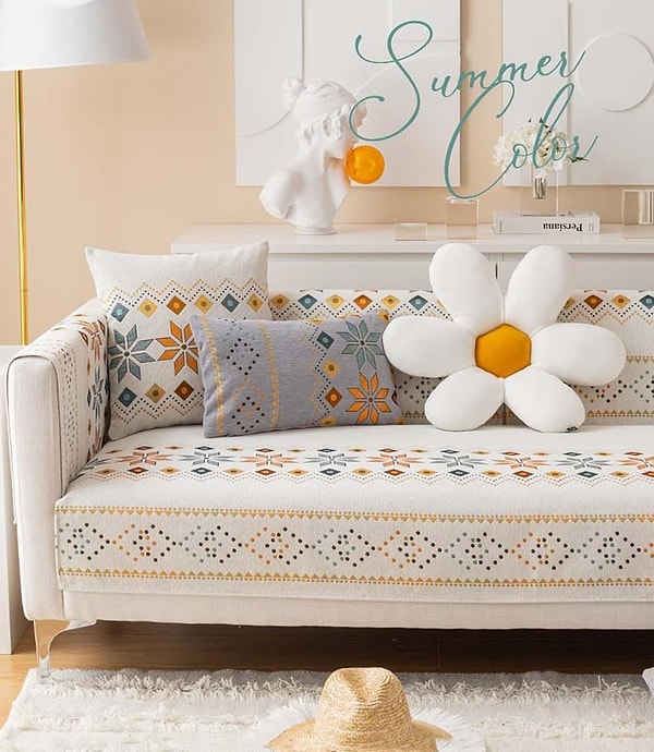 Evine yaz esintilerini getirmek için geometrik çiçek desenli bir kanepe örtüsü.