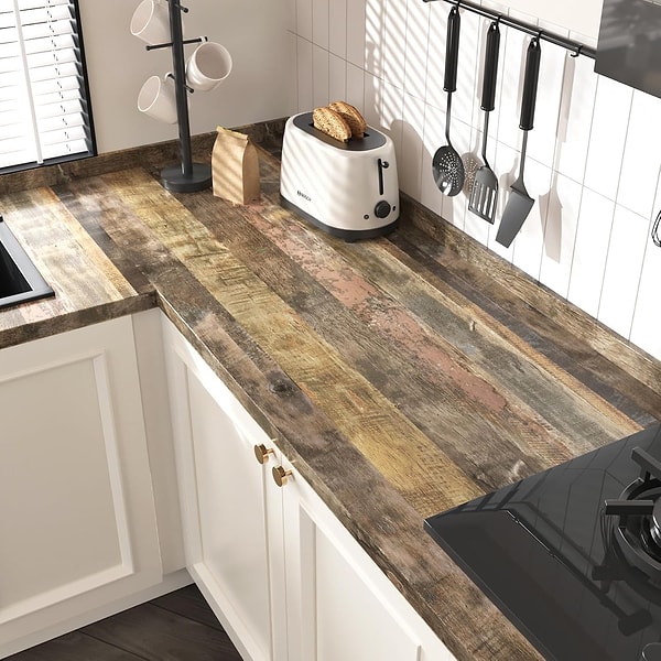 Mutfak tezgahınızı en pratik biçimde yenileyebileceğiniz ahşap görünümlü bir tezgah kaplaması.