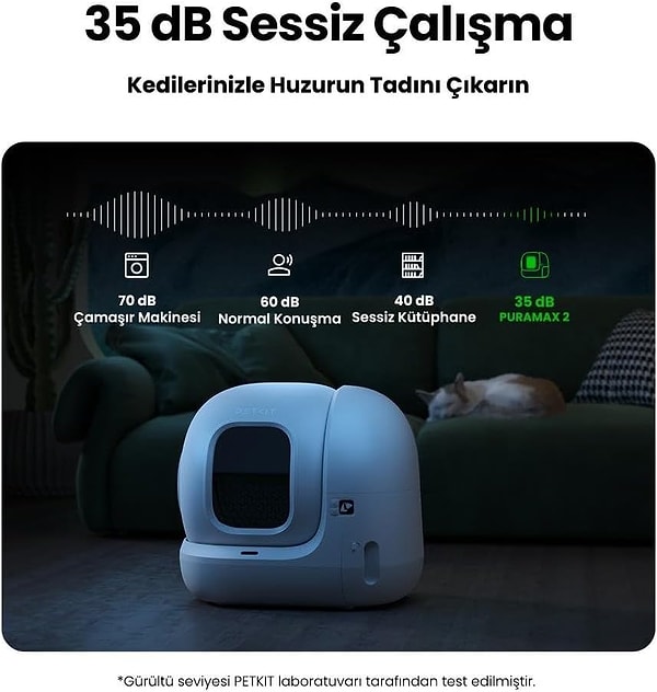 Sessiz Çalışma: Gece kedin tuvalete gitmesiyle uyanmak üzere bir kaygının yok. Petkit Pura Max 2, sessiz çalışıyor ve kedinin alışması çok kolay.