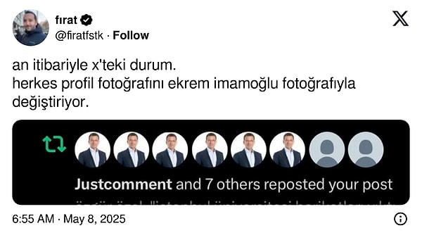 Yanıt olarak profil fotoğrafları Ekrem İmamoğlu olarak değişti. Lakin X bu hareketi bir bot saldırısı olarak algılayıp İmamoğlu profil fotoğrafı olanlara kısıtlama getirdi.