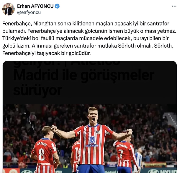 Niang’dan beri kapanan kadroları açacak forvet gelmediğini tespit eden ünlü tarihçi mesleğinde Trabzonspor da olan Atletico Madrid’in Norveçli golcüsü Alexander Sörloth’u önerdi.