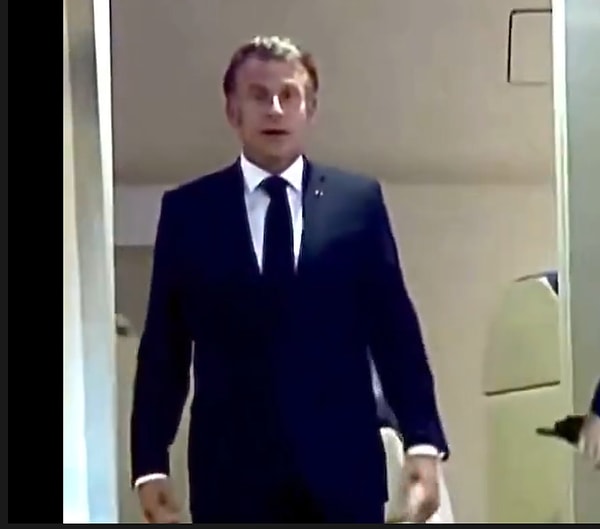 Daha sonra Macron’un ve eşinin uçaktan çabucak inmediğini görüyoruz. Macron’un kendine gelmesi birkaç dakika sürüyor. Kendisini sakinleştirmek isteyen Macron, elini daima yüzüne götürüyor, burnuna dokunuyor.