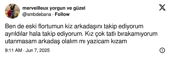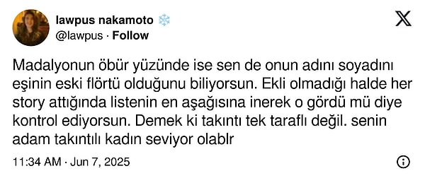 ‘Yıllardır eşimin lisedeki flörtü her attığım her story’e bakıyor. Ekli değil, onun ismini soyadını bildiğimi bilmiyor. Tanımam etmem. Engellemiyorum, zira ne vakit vazgeçecek diye merak ediyorum. Bugün tekrar bakmış. Nitekim hiç bıkmıyor. 40 yaşına geldik yahu neyin takıntısı bu.’