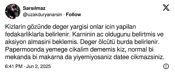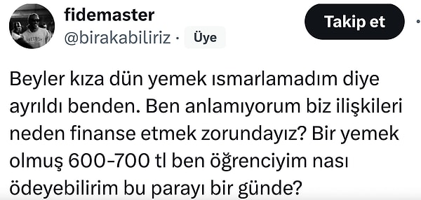 Alım gücünün düşüklüğü ve dünya rekorlarını tek tek kıran besin enflasyonu aşk meşk kesimini de olumsuz manada etkiledi. Birinci buluşmalarda hesabı kim öder kanısı yerini en ekonomik date’e nasıl çıkılıra bıraktı. Bir X kullanıcısı da yemek ısmarlamadığı için terk edildiğini anlattı. Lakin gelen yansılara nazaran kendisi de o kadar hatasız değildi.