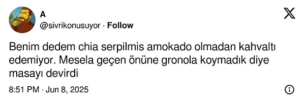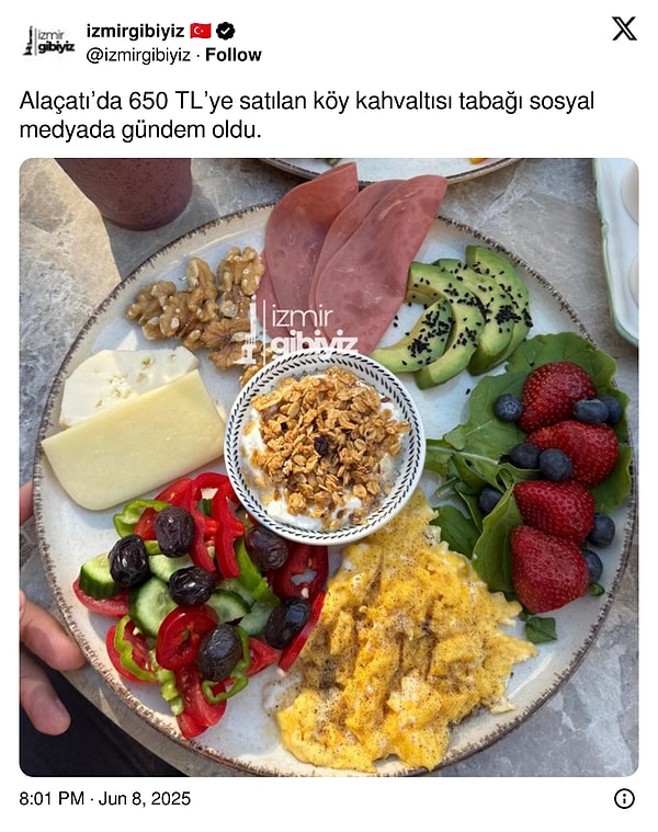 Türk kahvaltısı dünyada bile bir mutfak fenomeni. O kadar çok çeşit ve farklı eser var ki Türk kahvaltısının bile kendi içinde konseptleri var. Bunlardan birisi de yöresel eserlerin tartıda olduğu köy kahvaltısı. Lakin Alaçatı’da bir yerde satılan kahvaltı tabağı fiyatından çok içeriğiyle konuşuldu. Zira içinde avokado, granola, yabanmersini üzere köy hayatıyla pek eşleşmeyen eserler vardı.
