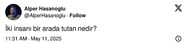 Evet aslında bu soru hayli önemli ve derin bir soru: ‘İki insanı bir ortada tutan nedir?’Bu soruyu size yöneltelim ve eminim ‘sevgi, hürmet, inanç, tutku’ cevapları hırla gürle gelir. X’te ‘@AlperHasanoglu’ isimli kullanıcı bu soruyu takipçilerine yöneltti. Klasik karşılıklar da geldi lakin goygoyunu durduramayanlardan da yaratıcı karşılıklar gecikmedi! Daima birlikte o karşılıklara bakalım. 👇
