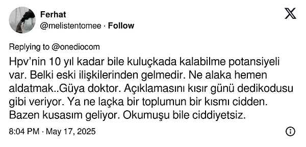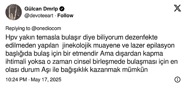 Burcu Akdağ’a, herkesin merak ettiği “Tuvaletten HPV kapılır mı?” sorusu soruldu. Bu türlü bir şeyin olmadığını söyleyen Akdağ “Bu tuvalet olayı, genelde ilgileri yok etmemek için biz hekimlerin kimi vakit başvurduğu suçsuz bir palavradır.” dedi.