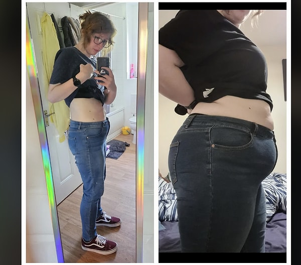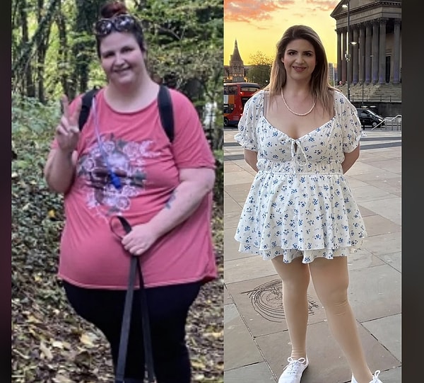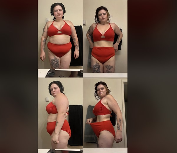 ‘En yüksek kilomda bir fotoğrafım yok lakin sağdaki fotoğrafta 102 kiloyum, şu anda 61 kiloyum. Artık deri sarkma ameliyatı için para biriktirmeye çalışıyorum!’