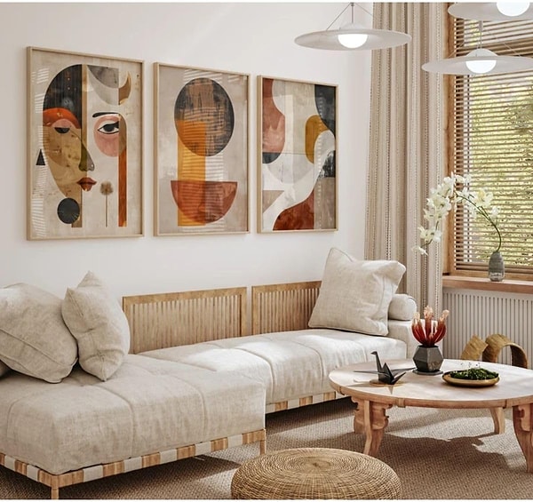 Boş kalan duvarlarınıza yumuşak bir dokunuşla ruh katacak olan üçlü soyut tablo.