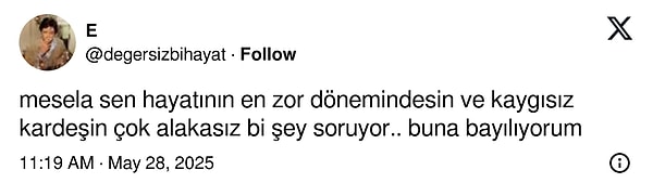 Günlük hayatta, iş yahut eğitim hayatında sizi zorlayan meseleler olabilir, işiniz başınızdan aşkın olabilir yahut duygusal manada güç vakitler da geçirebilirsiniz. Lakin kardeşiniz varsa bu dağ üzere kederleriniz birer mazeretten ibarettir. Zira odak noktası onlar olmalıdır. Bu bahiste bir X kullanıcısı keder yandı. Kısa müddette pek çok kardeşin tıpkı olduğunu gördü.