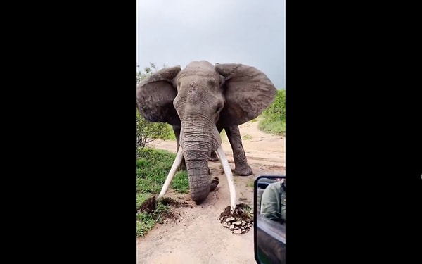Bir safari esnasında aracın geçtiği yol üzerindeki fil öfke nöbeti geçirdi. Dişlerini toprağa geçiren fili farkeden safari kafilesi, aracı süratlice geri geri sürerek oradan uzaklaştı.