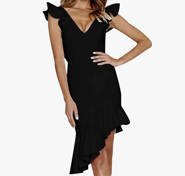 newrong Bayan Derin V Yaka Fırfırlı Yan Yırtmaçlı Kokteyl Elbisesi