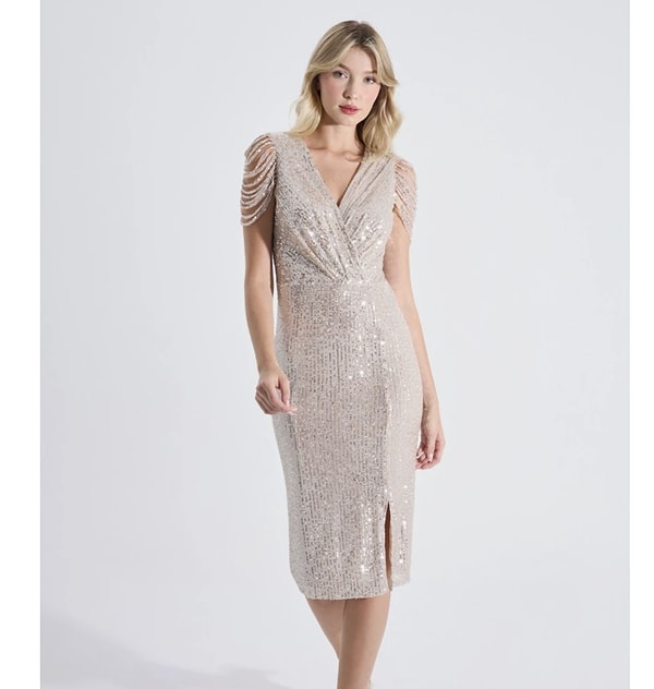 Biraz daha şık olayım, biraz daha dikkat çekeyim diyorsan, HOX’S Gloria tam senlik! Payet ayrıntılarıyla ışıltıyı doruklara taşıyan bu midi kalem elbise, kruvaze yaka ve önden yırtmaç ayrıntısıyla zarafeti tekrar tanımlıyor. Bej rengiyle sofistike bir duruş sergilerken, her adımında iddianı konuşturacak!