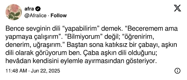 Sevginizi nasıl gösterirsiniz? Toplumsal medyada ‘sevgi dili’ diye tanım edilen olay, insanların sevgilerini söz etme ve algılama yollarıdır. Kimisi daima karşısındaki sevdiğini söyler, kimisi sevdiği kişi için yemek pişirir, kimisi fizikî teması tercih eder. Herkesin sevgi lisanı farklıdır ve kimsenin sevgi lisanına kimse karışamaz :)