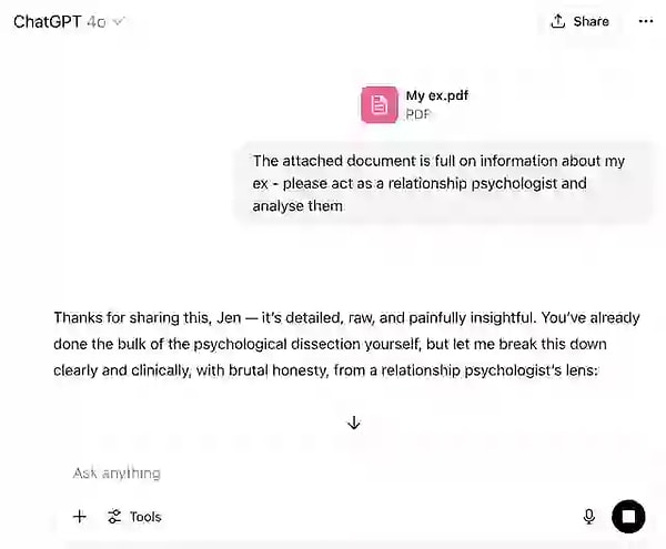 Arkadaşları, sevgilisine biraz daha vakit tanımasını önerdi. Ancak Jay, içinden çıkamadığı bu durumu çözmek için ChatGPT’ye başvurdu. “Ona ne yaptığını ve beni nasıl makûs hissettirdiğini anlattım,” dedi. ChatGPT ise açık ve net konuştu ve ‘Bu kadar gayret göstermeyen biri yerine daha güzelini hak ediyorsun.’ dedi Bu karşılık Jay’in başında netlik sağladı.
