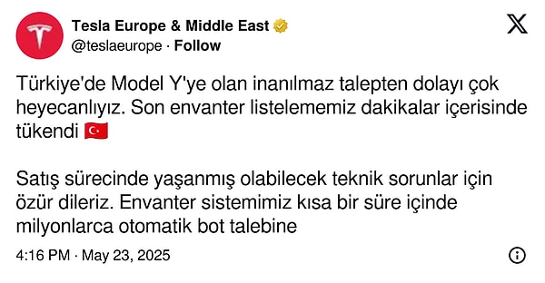 ‘Türkiye’de Model Y’ye olan inanılmaz talepten ötürü çok heyecanlıyız. Son envanter listelememiz dakikalar içerisinde tükendi 🇹🇷