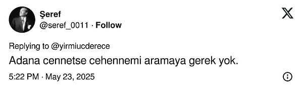 ‘Bizzat Tevrat’taki sözler. Adanalıların hepsi bunu bilmeyebilir. Tevrat’ta bahsedilen cennet Aden bahçesi Adana ismi Aden’le etimolojik olarak benzeridir. Oradan geliyordur büyük ihtimalle. Bir doğuda bahçeden bahseden ve dört ırmak vardır bu bahçede. Fırat, Dicle, Pişon ve Gihon. Fırat ve Dicle’yi biliyoruz. Pişen ve Gihon da Seyhan ve Ceyhan ırmaklarıdır aslında. Münasebetiyle cennet Adana ve civarı diyebiliriz.’