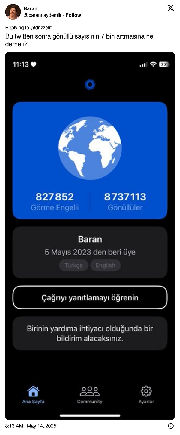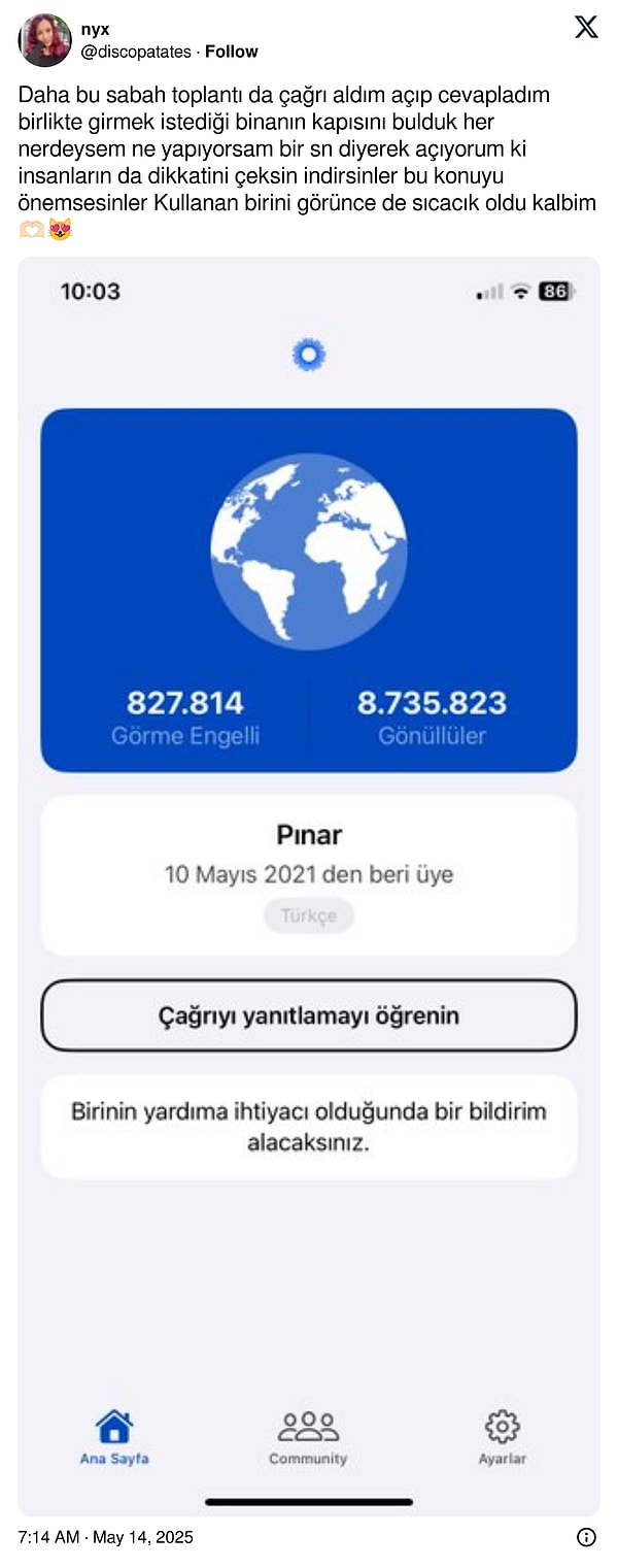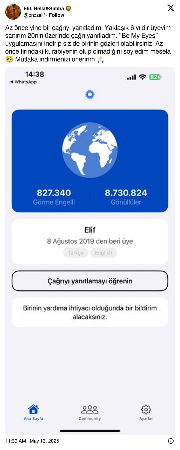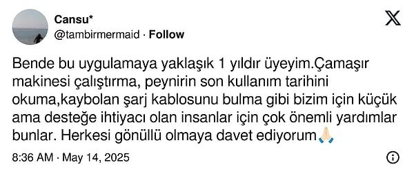 Uygulamayı bir kere daha akıllara kazıyan ise bir toplumsal medya kullanıcısının, “Be My Eyes uygulamasını indirip siz de birinin gözleri olabilirsiniz.” diyerek attığı tweet oldu.