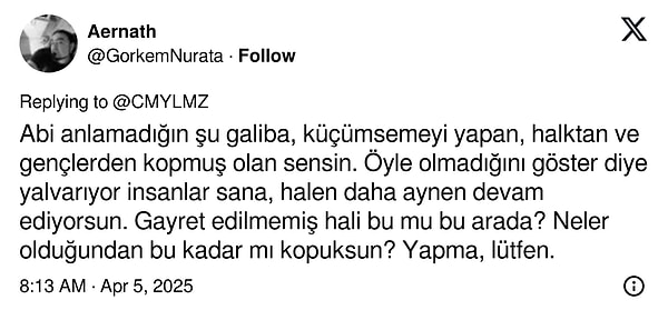 Bir kullanıcı 19 Mart’tan bugüne yaşananları özetleyerek Cem Yılmaz’a “Ne geldi başına?” dedi.