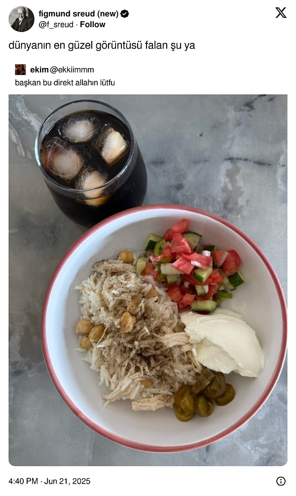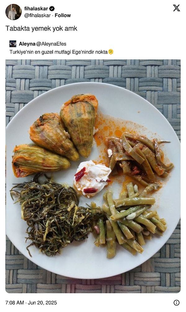 Üniversite imtihanları bitti, okullar kapandı, herkese büyük bir rahatlama geldi. Doğal çalışmaya devam edenler hariç. Neyse ki sizin de bu haftayı ağız tadıyla kapatabilmeniz için buradayız. Bu hafta da yemeklerle ilgili tweetleriyle bizleri mizaha doyurmayı başaran, ağzımızın tadını yerine getiren X kullanıcıları vardı.