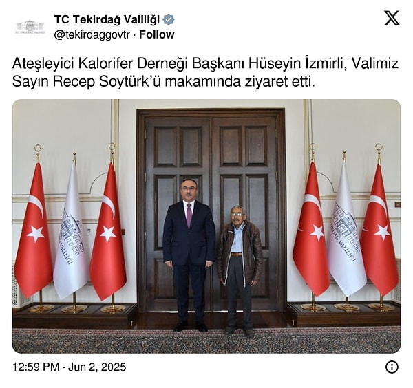 Tekirdağ Valisi Valisi Recep Soytürk, Ateşleyici Kalorifer Derneği Başkanı Hüseyin İzmirli ile bir ortaya geldi.